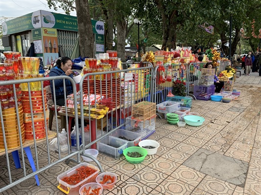 Năm nay, hàng rào an ninh được thiết lập bên ngoài Chùa Trấn Quốc nhằm vừa tạo điều kiện cho các tiểu thương buôn bán, người đi bộ cũng có thêm không gian để đi du Xuân