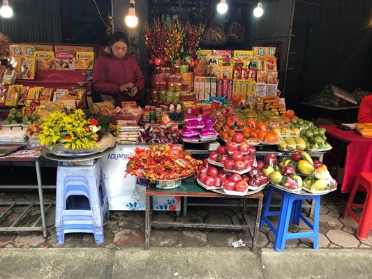 Một số mặt hàng lễ được bày bán phục vụ khách hàng. Theo bà Hoa, một tiểu thương buôn bán lâu năm tại Phủ Tây Hồ, năm nay do đêm 30 và ngày mùng 1 thời tiết không được thuận lợi nên việc buôn bán của bà ít nhiều bị ảnh hưởng, sức mua có phần chậm hơn
