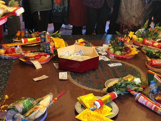 Theo ghi nhận của phóng viên, hiện tượng đặt tiền lẻ lên bàn lễ vẫn diễn ra. Tiền lẻ được bỏ la liệt trên sập dù khay để tiền đã được bố trí