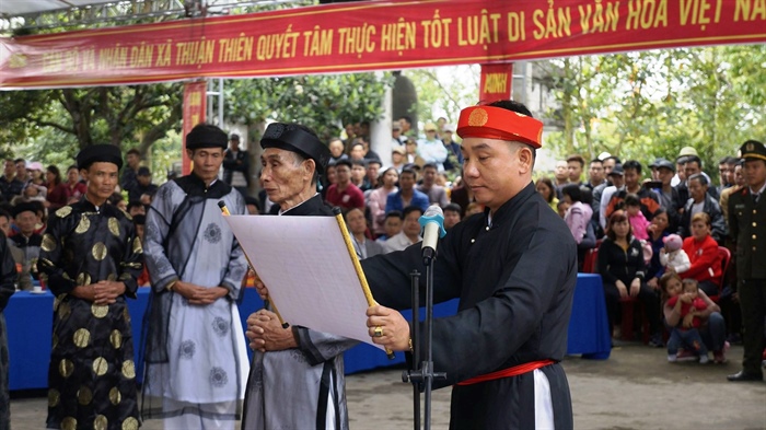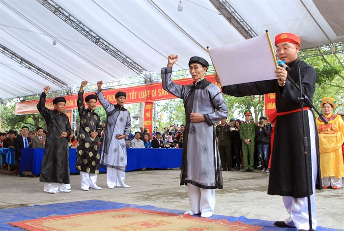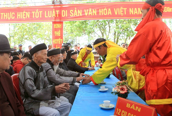 Các chức sắc trong làng, xã cùng thực hiện nghi lễ thề