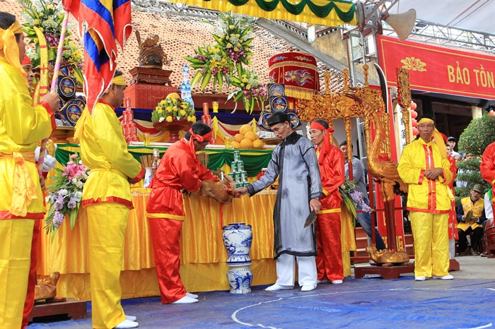 Chủ tế thực hiện nghi thức cắt tiết kim kê, hòa vào bình rượu