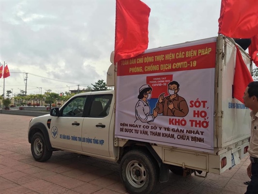 Xe tuyên truyền lưu động của Trung tâm VH&TT huyện Quảng Trạch đi tuyên truyền phòng, chống dịch