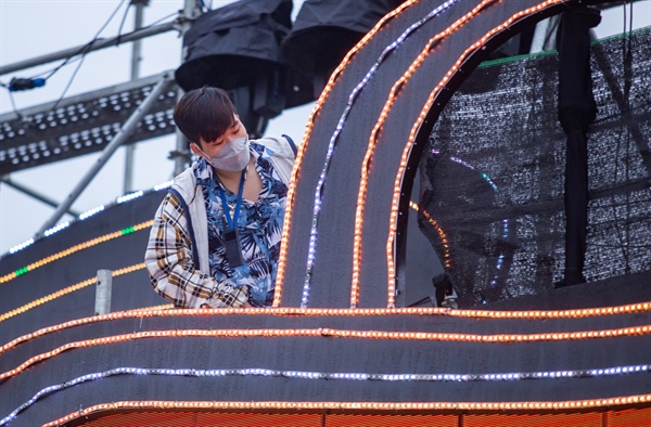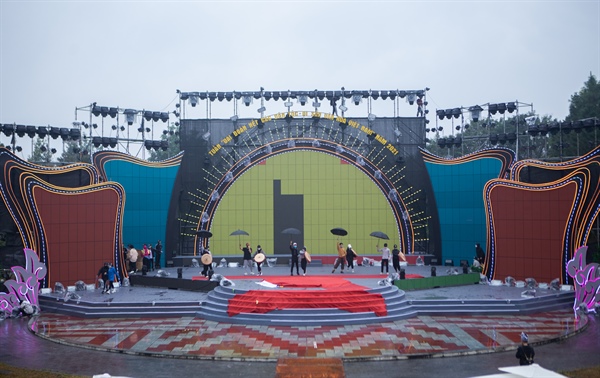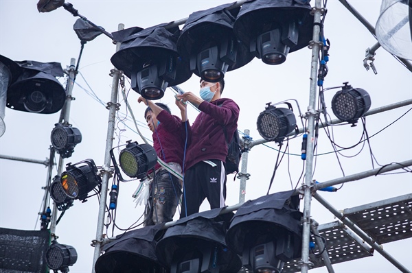 Sân khấu diễn ra chương trình khai mạc đang được gấp rút lắp đặt hoàn thiện những thiết bị cuối cùng