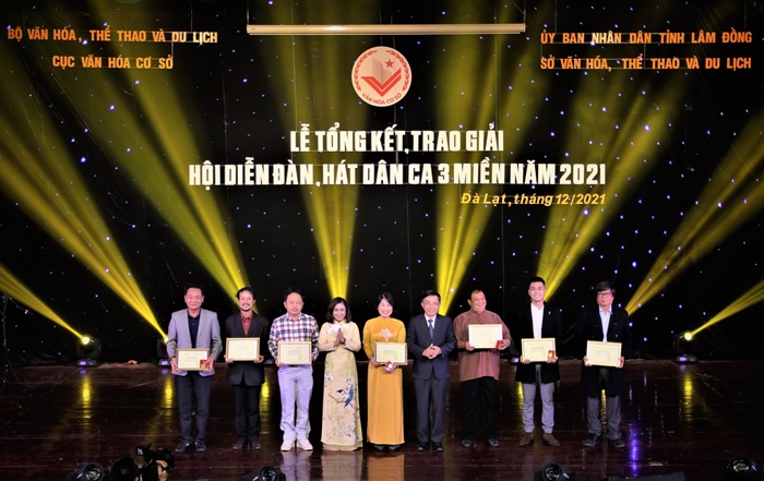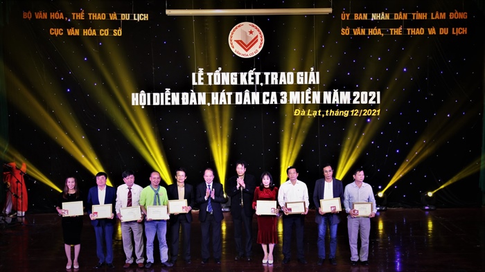Cục trưởng Cục Văn hóa cơ sở Ninh Thị Thu Hương; Phó Chủ tịch UBND tỉnh Lâm Đồng Đặng Trí Dũng trao Huy chương Vàng Chương trình cho các đơn vị xuất sắc