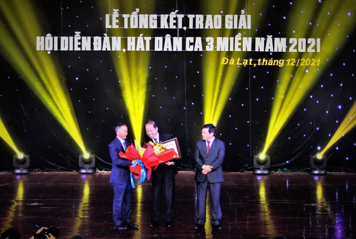 Thứ trưởng Bộ VHTTDL Đoàn Văn Việt; Phó Bí thư Tỉnh ủy, Chủ tịch UBND tỉnh Lâm Đồng Trần Văn Hiệp trao Bằng khen của Bộ trưởng Bộ VHTTDL và hoa cho Sở VHTTDL tỉnh Lâm Đồng