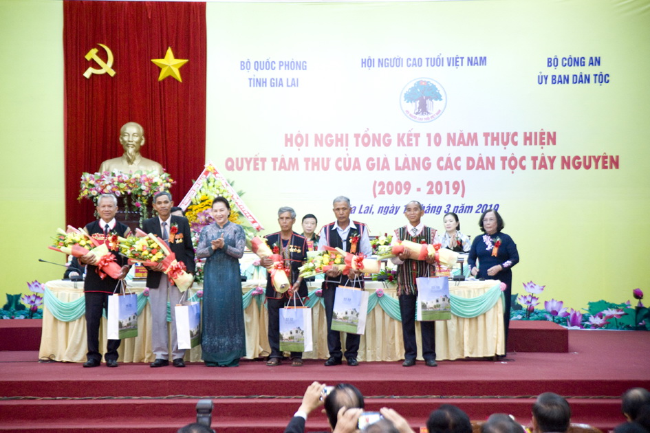 Tại hội nghị, Chủ tịch Quốc hội Nguyễn Thị Kim Ngân đã trao kỷ niệm chương, quà và hoa cho các già làng tiêu biểu có nhiều đóng góp trong công tác đại đoàn kết dân tộc, xây dựng đời sống văn hóa, phát triển kinh tế tại buôn làng trong 10 năm qua. Lãnh đạo Uỷ ban TƯ MTTQ Việt Nam trao 5 bức trướng cho Hội Người cao tuổi của 5 tỉnh Tây Nguyên.