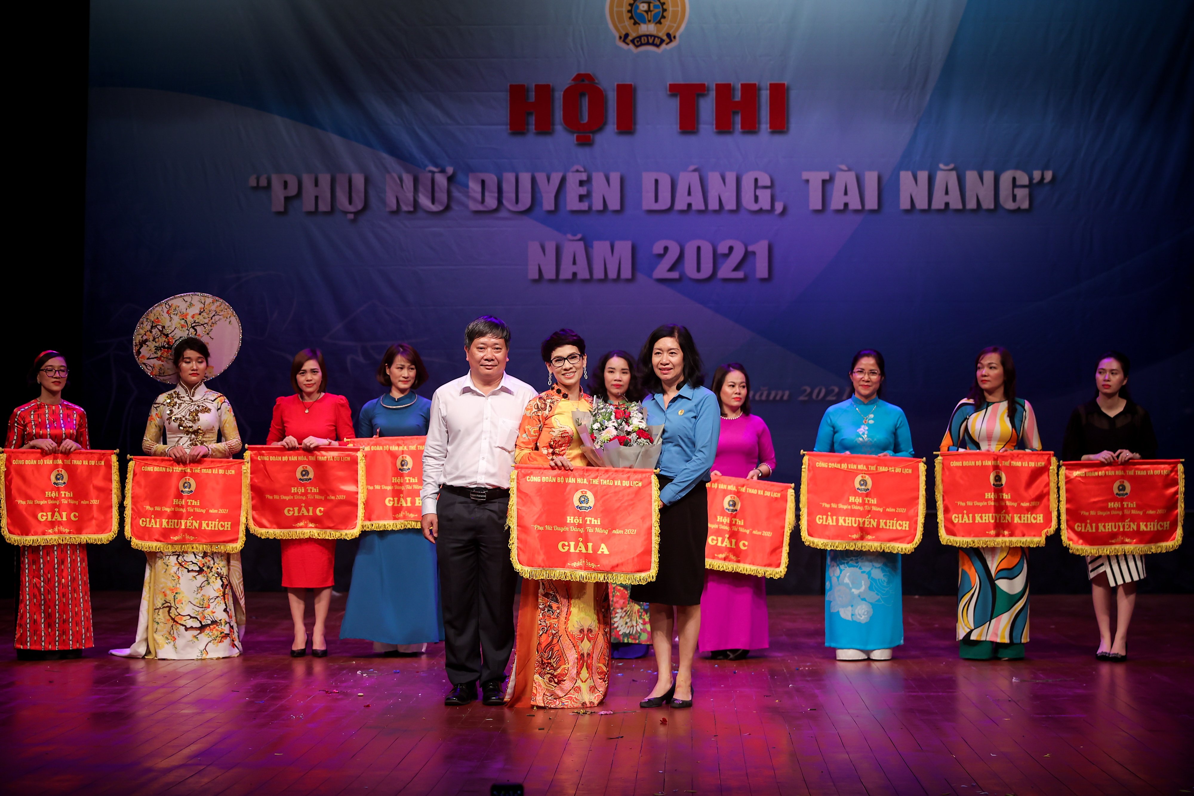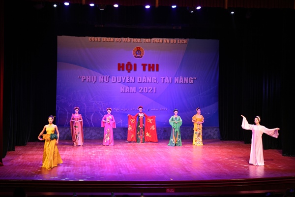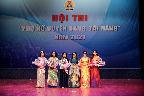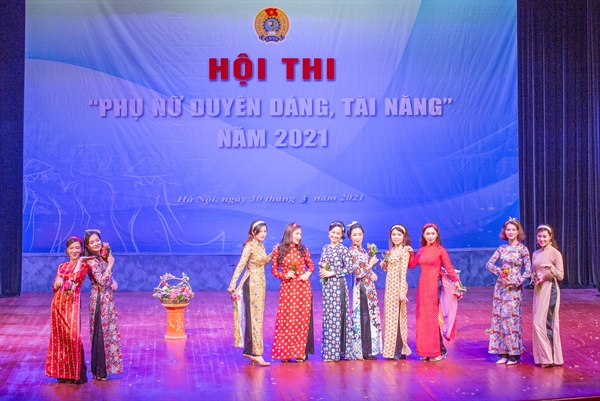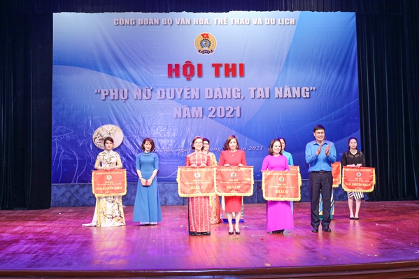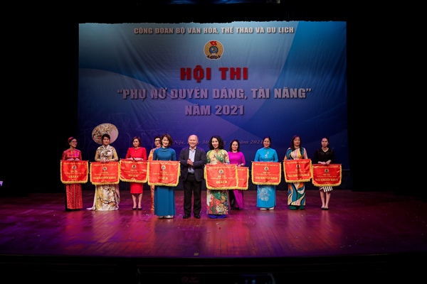 | Kết quả giải thưởng Hội thi “Phụ nữ duyên dáng, tài năng” năm 2021 1 Giải A thuộc về Công đoàn Liên quân khối tham mưu quản lý nhà nước 2 Giải B thuộc về Công đoàn Trường cán bộ quản lý văn hóa thể thao và du lịch, Công đoàn liên quân Khối Di sản văn hóa cơ sở (Đội 2) 3 Giải C thuộc về Công đoàn liên quan khối nghệ thuật biểu diễn (Đội 1), Công đoàn liên quân khối Di sản văn hóa cơ sở (Đội 1), Công đoàn liên quân Khối Điện ảnh. Ngoài ra còn có 4 giải Khuyến khích, Giải Đội có thí sinh mặc trang phục áo dài đẹp nhất, Giải Đội thể hiện phần thi tài năng ấn tượng nhất, Giải Đội có thí sinh trả lời câu hỏi hay nhất. |