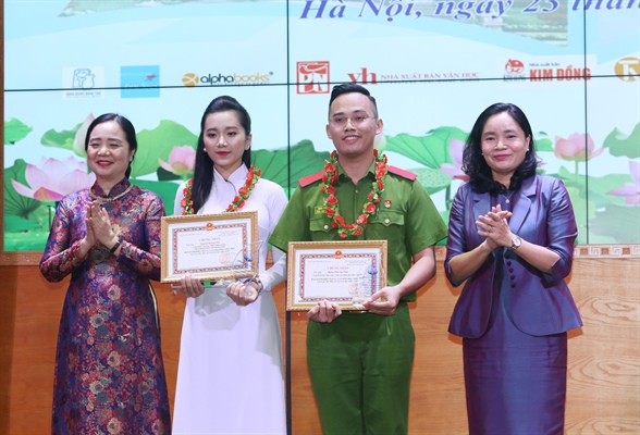 Thứ trưởng Bộ VHTTDL Trịnh Thị Thuỷ, Vụ trưởng Vụ Thư viện Vũ Dương Thuý Ngà trao giải cho 2 Đại sứ Văn hoá đọc mới