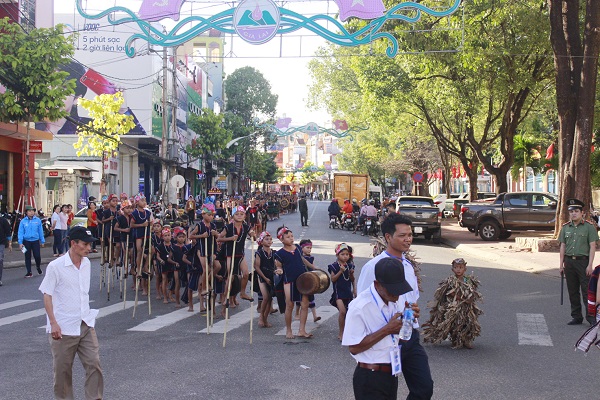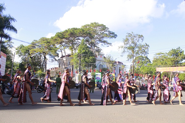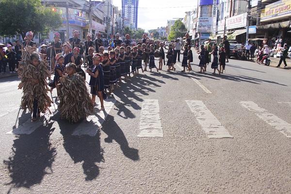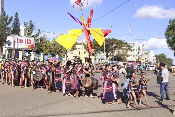 Các cung đường, ngõ phố rộn ràng vũ điệu múa xoang theo nhịp trống uyển chuyển và cuốn hút. Nhiều chàng trai Ê Đê cởi trần đóng khố khỏe mạnh gõ nhịp chiêng lúc trầm lúc bổng, khi dồn dập mạnh mẽ, lúc lại thánh thót vang xa…Tiếng cồng chiêng của lễ hội đường phố như tái hiện lại đời sống văn hóa của các dân tộc Tây Nguyên ngàn đời. Trên đường phố TP.Pleiku, hàng nghìn nghệ nhân, du khách cứ thế nối với nhau kéo dài trong vòng tay đoàn kết.