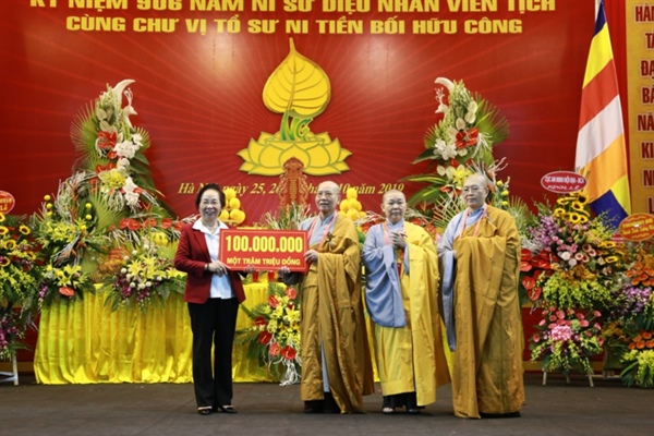 Tại buổi lễ, tiếp nối và phát huy tinh thần từ bi của Đạo Phật, Ban tổ chức đã trao tặng 100 triệu đồng ủng hộ Quỹ khuyến học Việt Nam. Ni trưởng Thích Đàm Nghiêm, Trưởng Ban tổ chức Đại lễ cùng Ni trưởng Thích Đàm Thành, Ni trưởng Thích Đàm Lan đã trao quà ủng hộ quỹ cho bà Nguyễn Thị Doan, Chủ tịch Hội khuyến học Việt Nam.