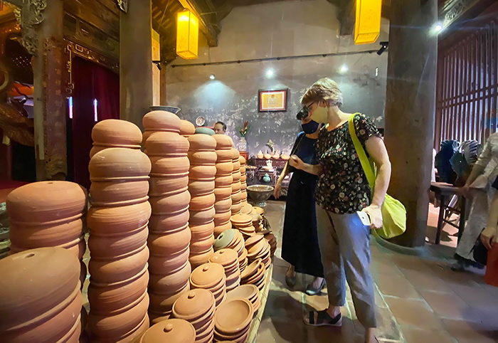 Du khách nước ngoài tham quan các sản phẩm gốm