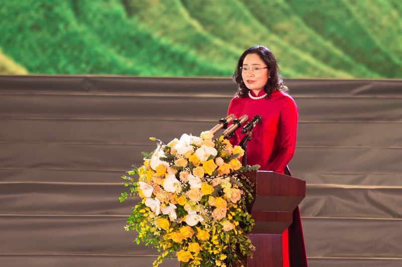 Thứ trưởng Bộ VHTTDL Trịnh Thị Thủy, Trưởng Ban Chỉ đạo Ngày hội Văn hóa dân tộc Mông lần thứ III phát biểu khai mạc Ngày Hội