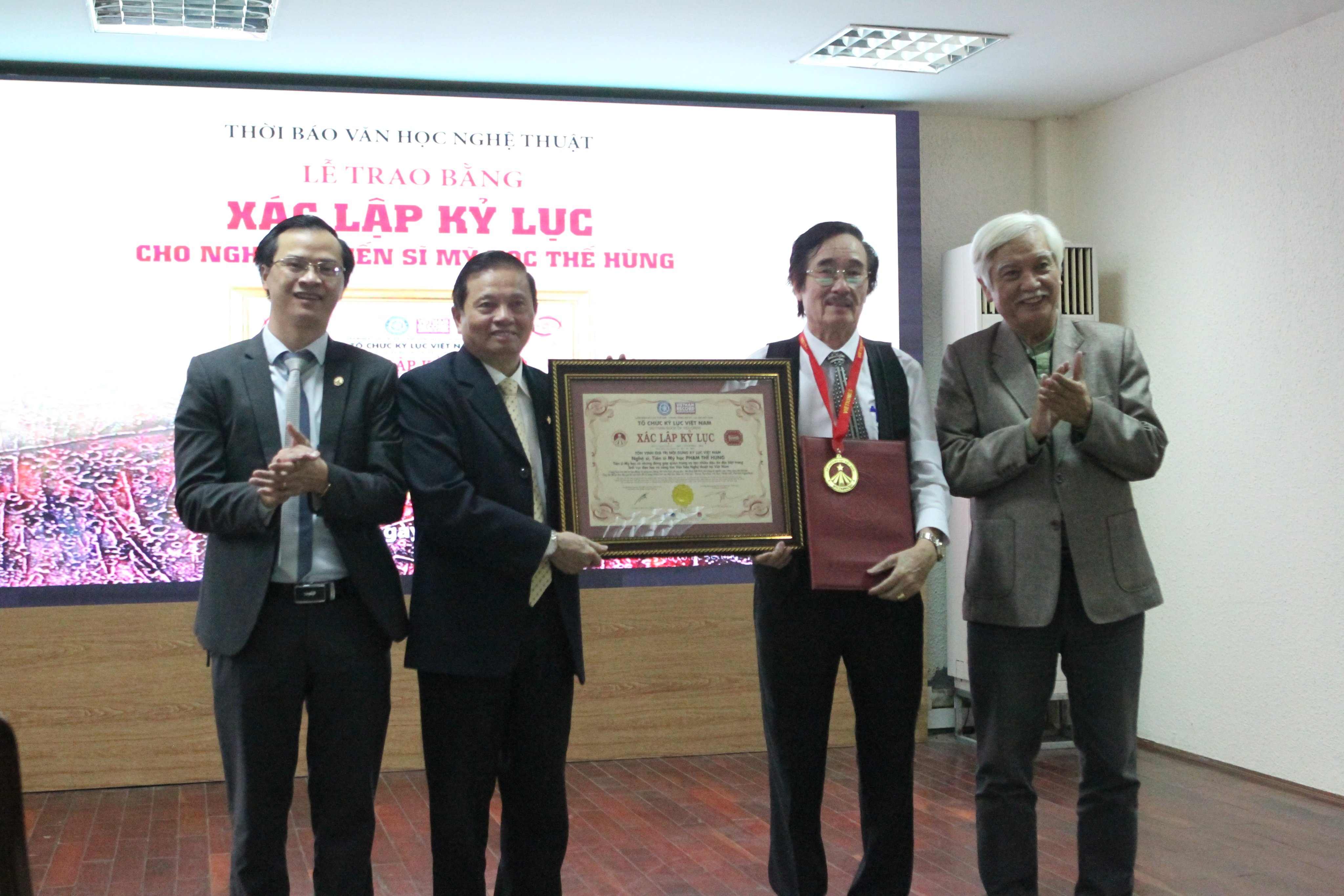VHO- Ngày 12.11 tại Hà Nội,  Bằng xác lập kỷ lục của Tổ chức Kỷ lục Việt Nam đã được trao cho Nghệ sĩ, Tiến sĩ Mỹ học Thế Hùng- người đã có những đóng góp quan trọng và tạo nhiều dấu ấn đặc biệt trong lĩnh vực đào tạo và sáng tạo văn hóa nghệ thuật tại Việt Nam.