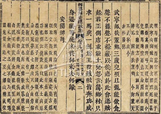 Mộc bản sách “Ngự chế Việt sử tổng vịnh tập”, quyển 9, mặt khắc 2 khắc ghi bài thơ ngự chế “Phù Đổng nhi” của vua Tự Đức về anh hùng đánh giặc Thánh Gióng (nguồn: Trung tâm Lưu trữ quốc gia IV)