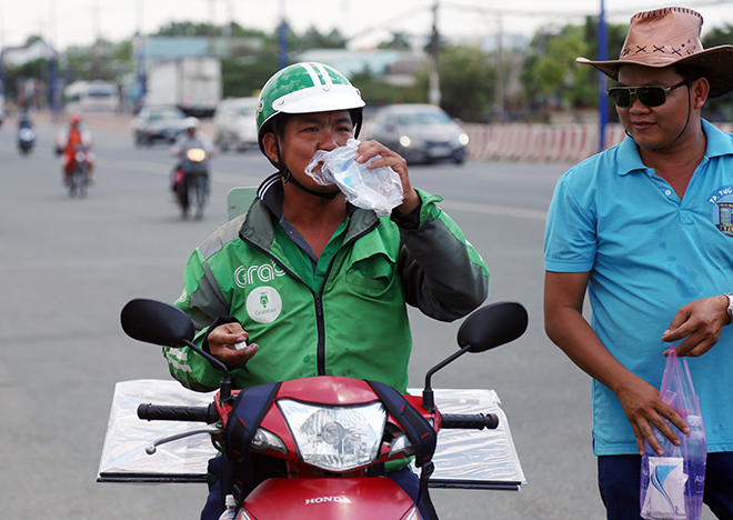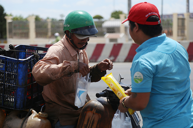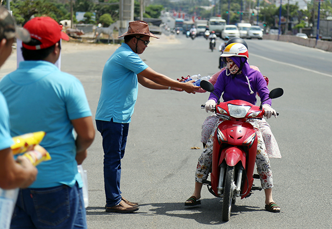 Giữa cái nắng như đổ lửa, người đi đường cảm thấy mát lòng khi được nhóm thiện nguyện mời uống nước miễn phí.
