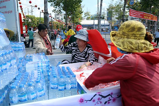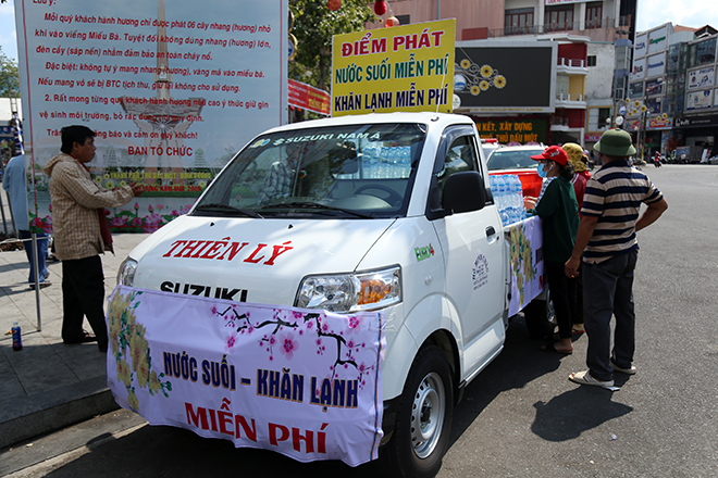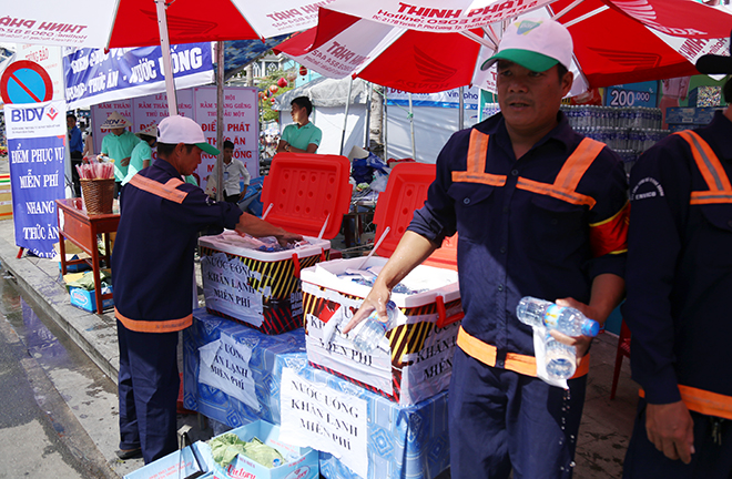 Nhiều người còn dùng xe tải để phục vụ nước uống, khăn lạnh miễn phí cho bà con. Chủ yếu là người dân tự bỏ tiền ra để mua nước suối, khăn lạnh. Một số nhóm thiện nguyện được doanh nghiệp, công ty trên địa bàn tài trợ bánh mì, nước suối… để phục vụ miễn phí cho khách hành hương