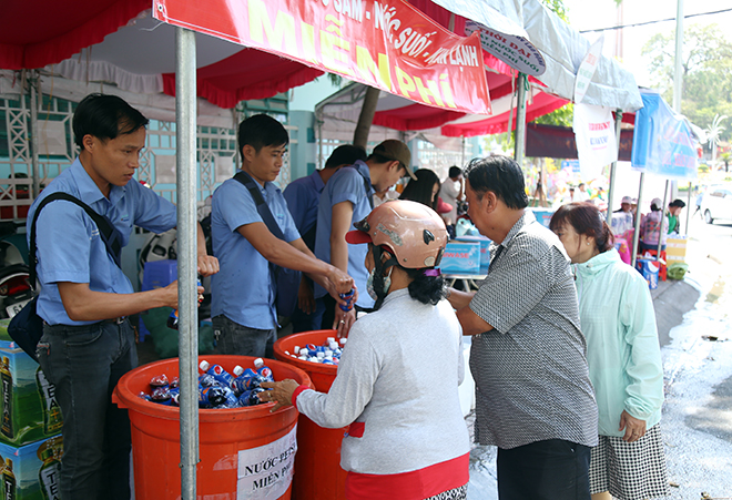 Quanh khu vực chùa Bà, hàng chục điểm phát nước uống, khăn lạnh, thức ăn miễn phí cho người dân và du khách hành hương.