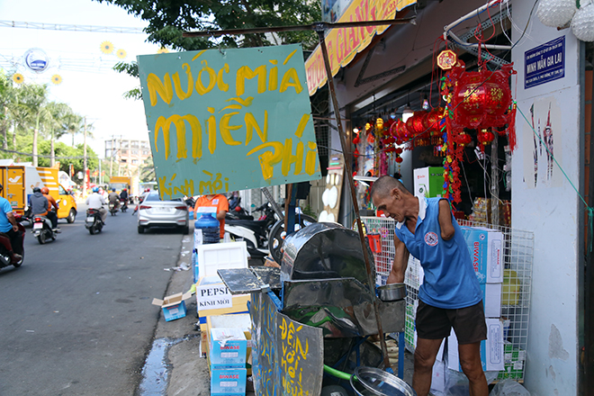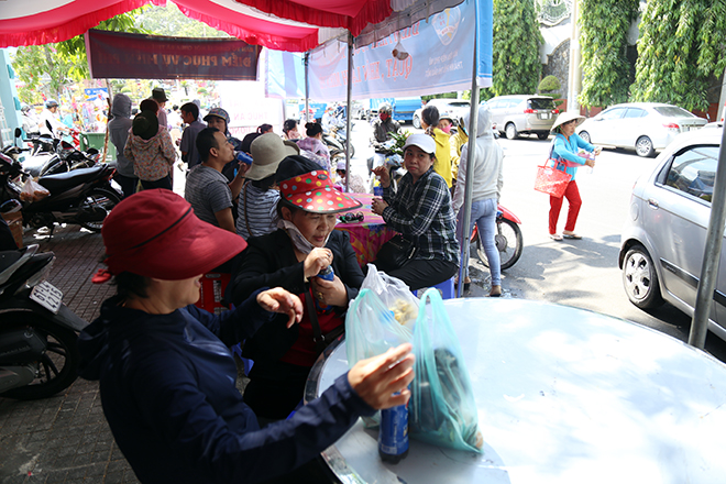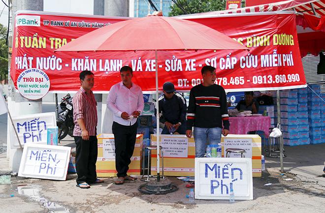 Tại chùa Bà, du khách không khỏi ngỡ ngàng khi quanh chùa, người dân mở hàng loạt điểm phát nước uống, khăn lạnh, bánh mì, vá xe… miễn phí. Trên vỉa hè dọc tuyến đại lộ Bình Dương đường đến chùa Bà, có cả chục điểm “tiếp sức” miễn phí cho người dân.