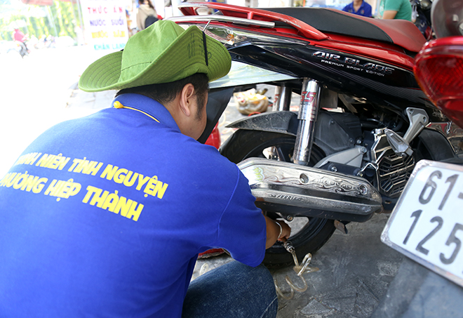 Dọc đại lộ Bình Dương, đường Yersin, Cách Mạng Tháng 8, Thích Quảng Đức... người dân và đoàn phường lập ra những chốt vá sửa và bơm xe miễn phí cho du khách thập phương