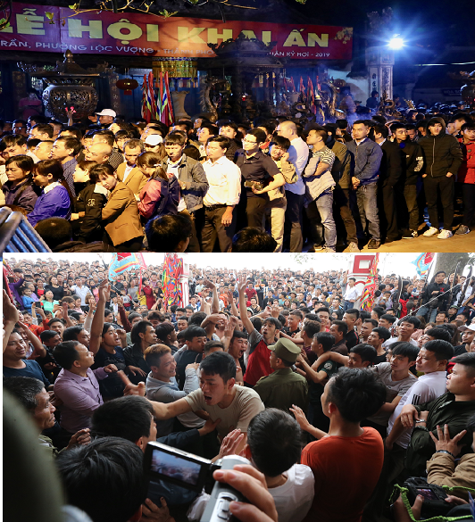 Người dân và du khách xếp hàng trật tự chờ giờ phát ấn tại Lễ hội đền Trần Nam Định 2019 (đêm 14, sáng 15 tháng Giêng - ảnh lớn) và hình ảnh những thanh niên quá khích tràn vào cửa đền tại Hội Phết Hiền Quan 2019 (Phú Thọ) sau khi bị dừng đánh phết (chiều 13 tháng Giêng năm Kỷ Hợi)