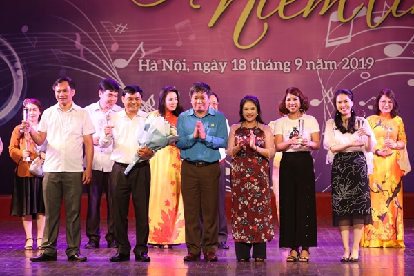 Chủ tịch Công đoàn Bộ VHTTDL Nguyễn Tuấn Linh và NSND Thanh Ngoan, Trưởng Ban giám khảo trao giải A cho các đơn vị