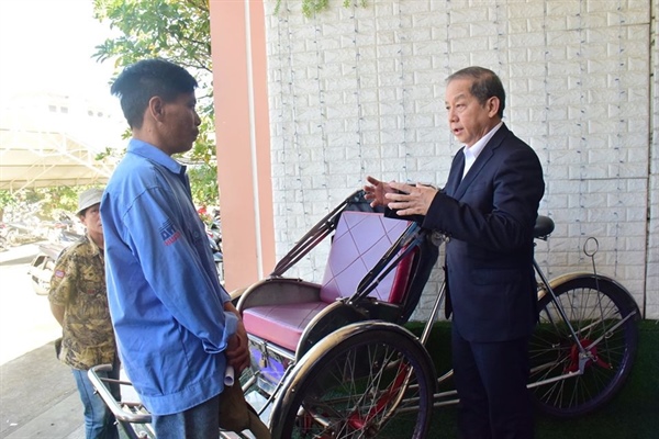 Chủ tịch tỉnh Thừa Thiên Huế (phải) trao đổi, hỏi thăm người đạp xích lô