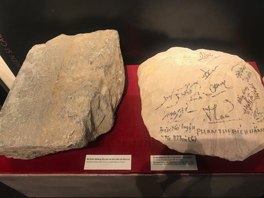 Đá hồn thiêng tại xà lim nhà tù Hỏa Lò; đá hồn thiêng lấy từ nơi cai ngục nhà tù Phú Quốc bắt tù nhân lao động khổ sai làm chết 1033 tù binh