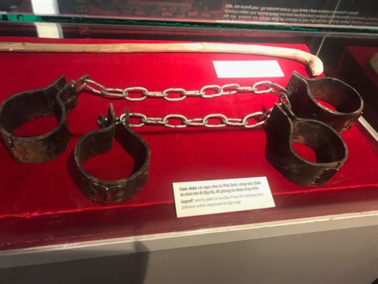 Nhiều hiện vật tại trưng bày không khỏi khiến người xem nghẹn ngào như: Cùm chân giam giữ chiến sĩ cách mạng tại nhà tù Hỏa Lò và Côn Đảo; chiếc đinh cai ngục nhà tù Phú Quốc đóng vào hộp sọ các chiến sĩ cách mạng bị địch bắt giam tại nhà tù; chuồng cọp dùng đề nhốt tù binh, thùng phuy để tra tấn tù binh; chín cái răng của đồng chí Vũ Minh Tằng (Vĩnh Hảo, Vụ Bản, Nam Định) bị cai ngục nhà tù Phú Quốc đục gãy và bắt nuốt vào bụng; gậy điểm danh của tên cai ngục khét tiếng Bảy Nhu ở Phú Quốc; Đá hồn thiêng lấy từ nơi cai ngục nhà tù Phú Quốc bắt tù nhân lao động khổ sai làm chết 1033 tù binh; Bát do cai ngục nhà tù Phú Lợi trộn thuốc độc vào cơm đầu độc chiến sĩ tại nhà tù Phú Lợi; 17 mũi chỉ inox do cai ngục nhà tù Phú Quốc mổ bụng đồng chí Trần Huy Mộc sau đó khâu lại để tù binh phải chết dần, chết mòn trong đau đớn…