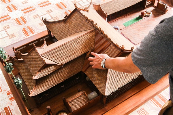 Nghệ nhân Phan Lạc Hùng nâng niu mô hình đình làng Hữu Bằng do chính bàn tay ông chế tác