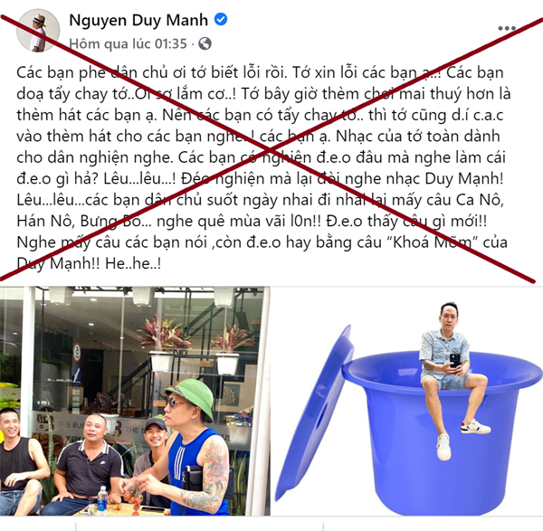 “Qua phản ánh của dư luận và rà soát trên không gian mạng, Cục Phát thanh, Truyền hình và Thông tin điện tử đã gửi công văn tới Sở Thông tin và Truyền thông TP.HCM yêu cầu mời tài khoản có tên Nguyen Duy Manh lên để làm việc. Đây mới là nickname trên trang cá nhân, bước đầu, chúng tôi phải làm việc để xác minh. Chúng tôi cũng đã phối hợp với Cục NTBD (Bộ VHTTDL) để xử lý nếu trong trường hợp tài khoản này đúng là của ca sĩ Duy Mạnh và đã có những phát ngôn như vậy. Còn trong trường hợp nếu tài khoản này không chấp hành biện pháp xử lý và đúng là tài khoản của ca sĩ Duy Mạnh thì Bộ TT&TT cùng Bộ VHTTDL sẽ có biện pháp xử lý nghiêm”.