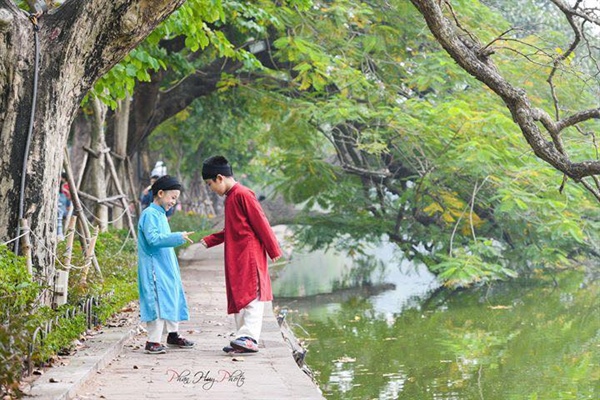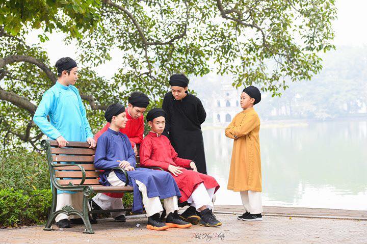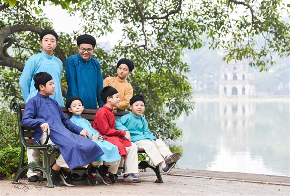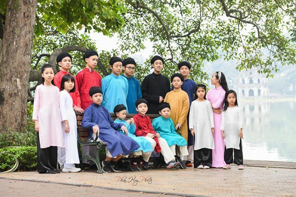 “Tôi được mời vào vai người vấn khăn cho các bé. Vừa ngắm dung nhan, vừa vấn khăn, tôi vừa giảng giải về chữ NHÂN, chữ NHẤT trên đầu để các cháu hiểu về giá trị bộ trang phục truyền thống Việt Nam chúng đang mặc trên người. Bé nào cũng đều cảm thấy tự hào vì lần đầu được mặc áo dài ngũ thân xuống phố. Các phụ huynh hào hứng chụp ảnh, khen ngợi không tiếc lời…”, anh Đinh Hồng Cường tâm sự.