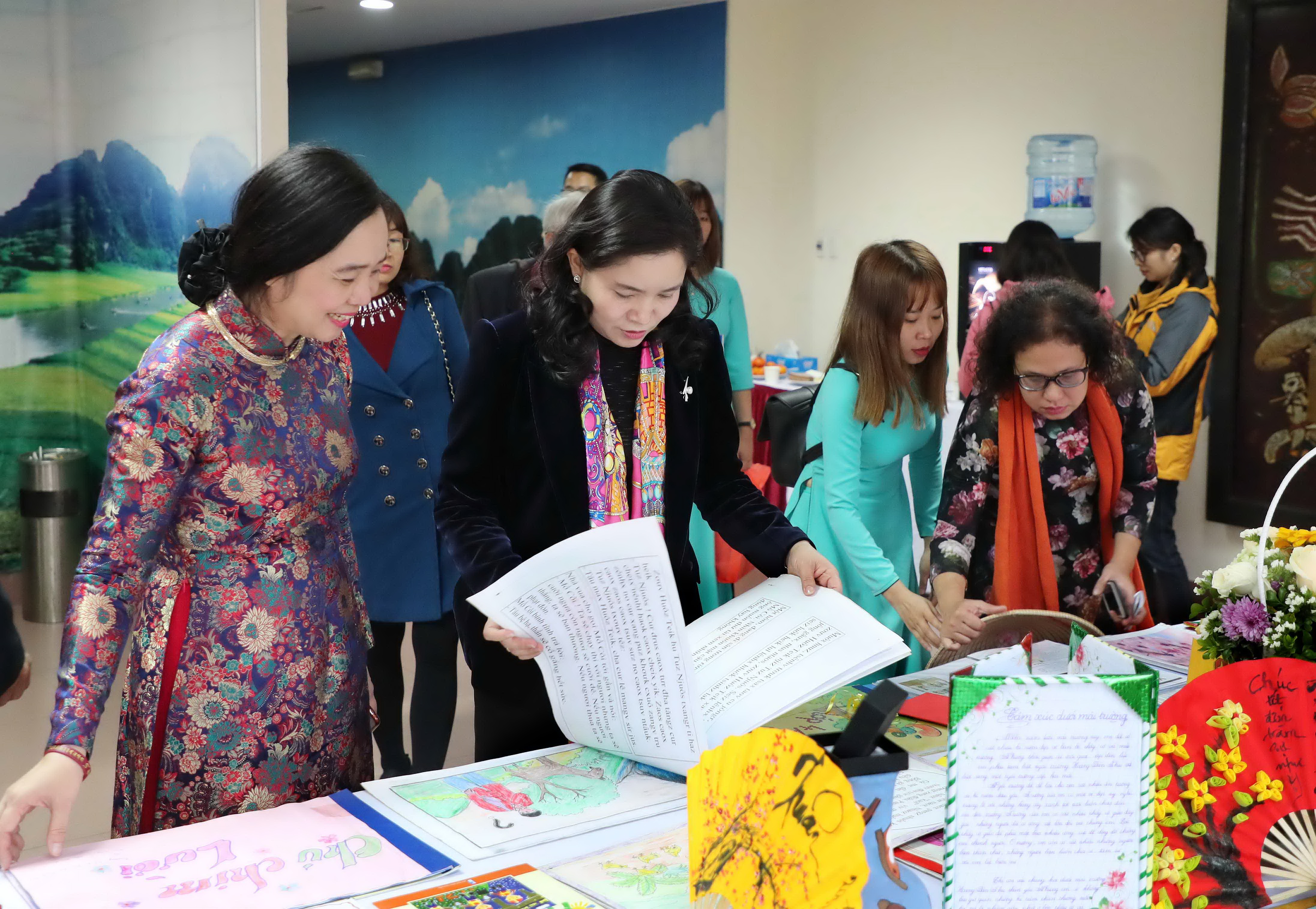 Thứ trưởng Trịnh Thị Thủy xem trưng bày một số sản phẩm và hình ảnh hoạt động khuyến học của các thư viện