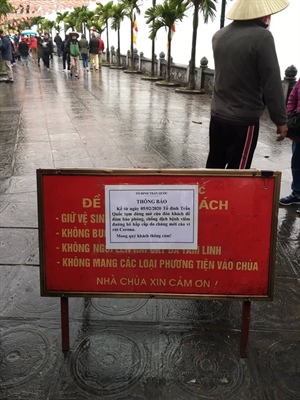 Tổ đình Trấn Quốc sáng 5.2 cũng dán thông báo: “Kể từ ngày 5.2.2020, Tổ đình Trấn Quốc tạm dừng mở cửa đón khách để đảm bảo phòng chống dịch bệnh viêm đường hô hấp cấp do chủng mới của virus corona.