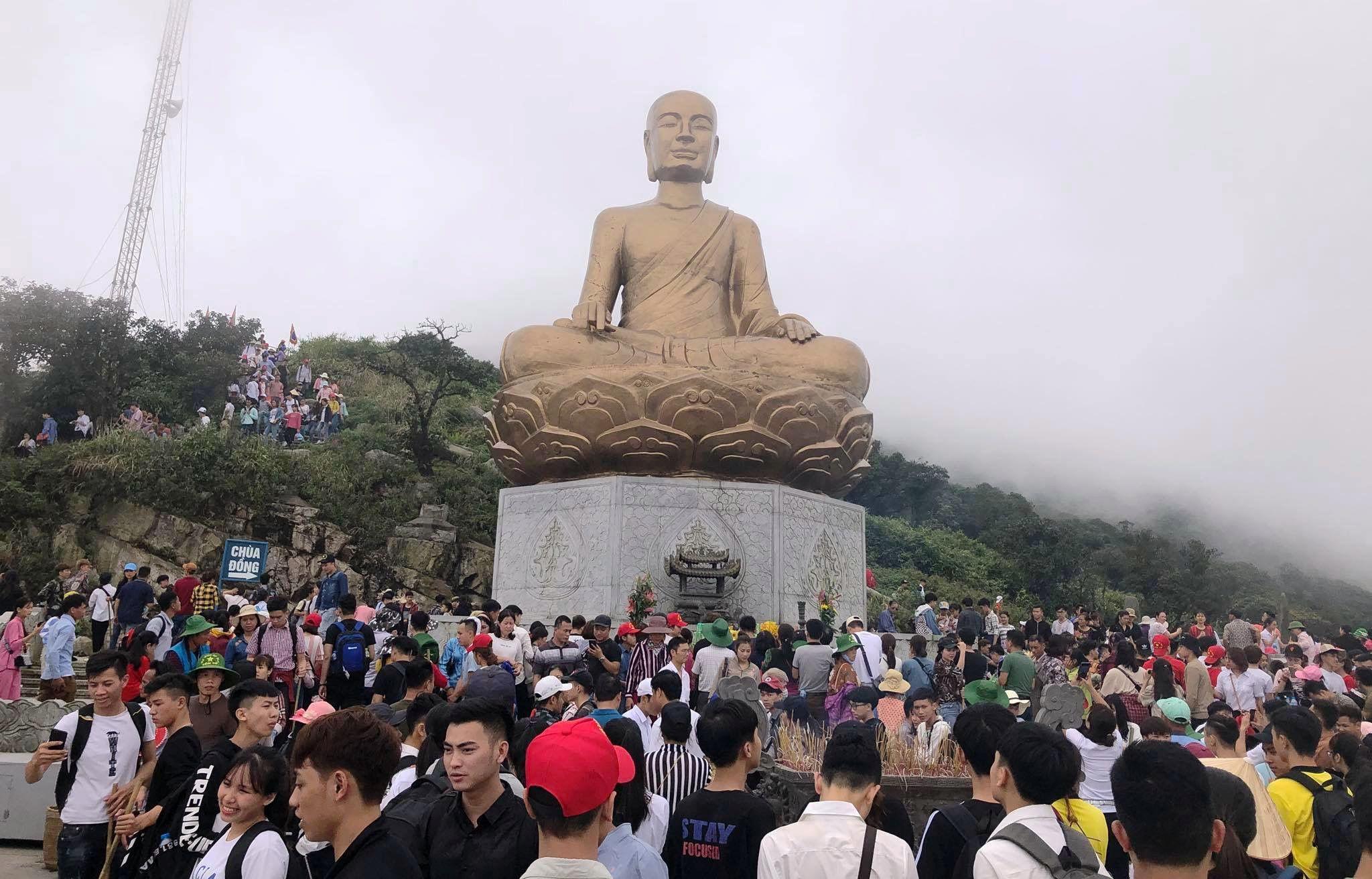 Du khách tham quan tại bảo tượng Phật hoàng Trần Nhân Tông, trên đỉnh Yên Tử