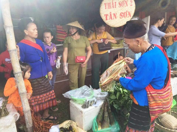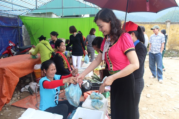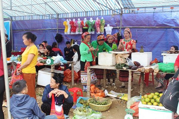 Bà con mang sản vật địa phương; váy, áo thổ cẩm bày bán.