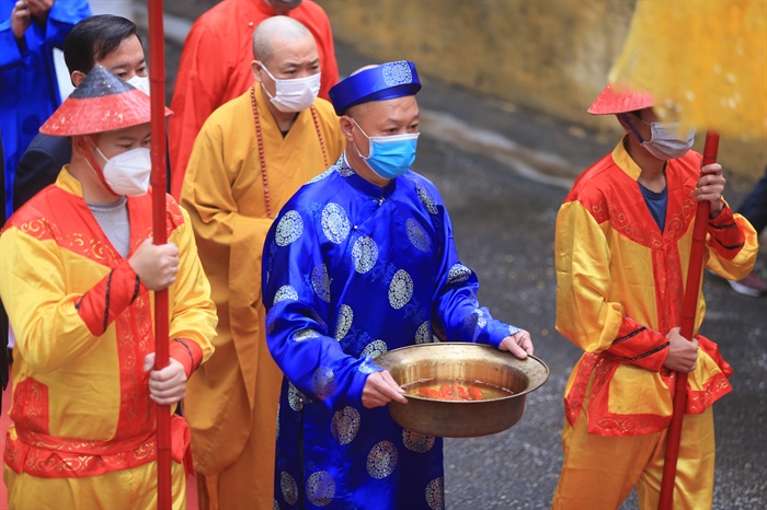 Theo đúng phong tục, nghi thức thả cá chép được chuẩn bị kỹ lưỡng, đoàn rước ăn mặc chỉnh tề trong trang phục truyền thống áo the, khăn xếp