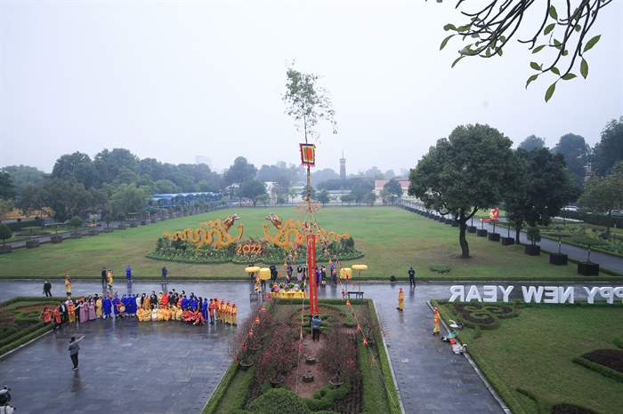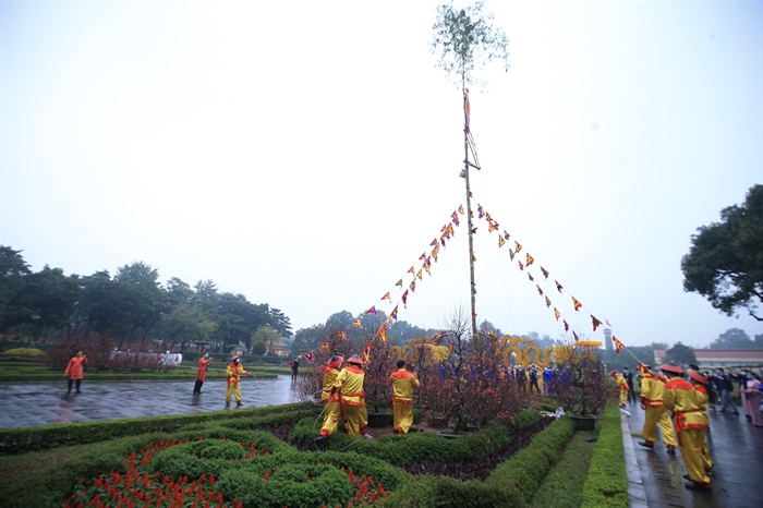 Sau nghi thức thả cá, đoàn rước trở về khu vực Đoan Môn tái hiện việc dựng cây nêu ngày Tết
