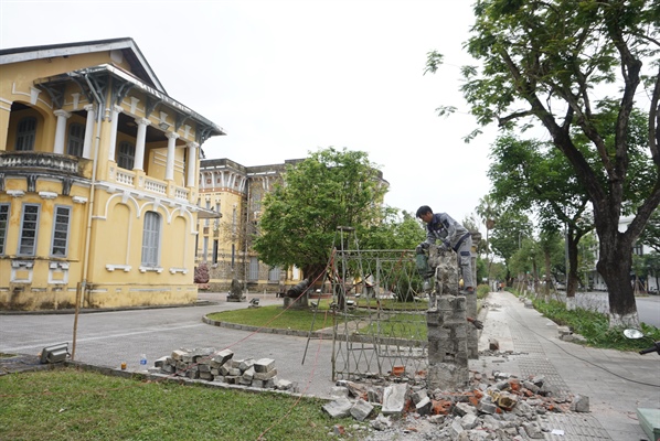 Công nhân đang tháo dỡ hàng rào, trụ cổng bê-tông để chỉnh trang không gian văn hóa tại khu nhà Pháp cổ số 23-25 Lê Lợi (trụ sở của Trung tâm Văn hóa Thông tin và Thể thao TP Huế