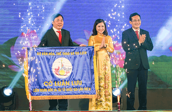 Cục trưởng Cục Văn hóa cơ sở Ninh Thị Thu Hương - Trưởng Ban tổ chức Liên hoan Đờn ca tài tử quốc gia lần thứ III trao cờ luân lưu cho đơn vị đăng cai Liên hoan lần IV năm 2025