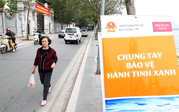 Quận Tây Hồ treo khẩu hiệu bảo vệ môi trường và cử các lực lượng chức năng để hỗ trợ và nhắc nhở người dân bỏ túi ni lông đúng nơi quy định và không được thả tro vàng mã xuống Hồ Tây