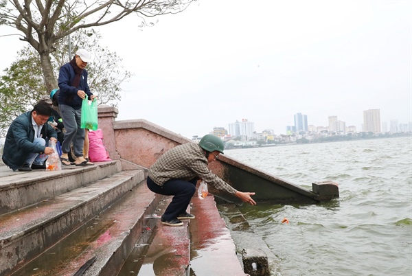 VHO- Theo phong tục của người Việt, vào dịp Tết ông Công, ông Táo (ngày 23 tháng Chạp), theo phong tục truyền thống, nhiều gia đình thực hiện các nghi lễ tâm linh, sau đó thả tro hóa vàng, chân hương, cá chép... xuống ao, hồ, sông...