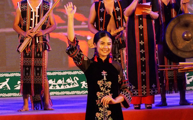 Hoa hậu Ngọc Hân trong trang phục được thiết kế bằng Dèng của đồng bào Pa-Cô, Tà-Ôi (huyện A Lưới) tại đêm bế mạc