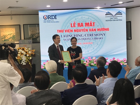 Bà Vũ Dương Thúy Ngà trao chứng nhận đăng ký hoạt động cho thư viện tư nhân Nguyễn Văn Hưởng