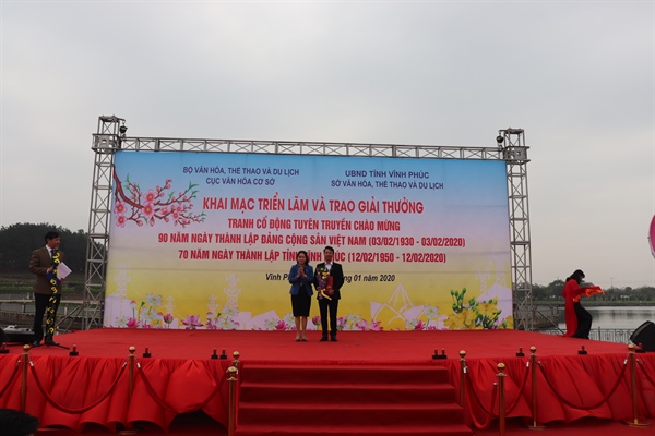 VHO- Lễ Khai mạc triển lãm và trao giải thưởng tranh cổ động tuyên truyền kỷ niệm 90 năm Ngày thành lập Đảng Cộng sản Việt Nam (3.2.1930-3.2.2020) đã được Bộ VHTTDL, UBND tỉnh Vĩnh Phúc phối hợp tổ chức ngày 15.1.2020 tại Quảng trường Hồ Chí Minh, TP. Vĩnh Yên, tỉnh Vĩnh Phúc. Thứ trưởng Bộ VHTTDL Trịnh Thị Thủy, Phó Chủ tịch UBND tỉnh Vĩnh Phúc Vũ Việt Văn đã dự và cắt băng khai mạc triển lãm.