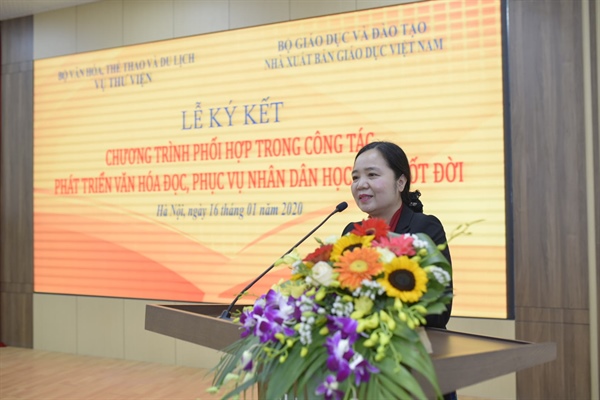 Phát biểu tại buổi Lễ ký kết, bà Vũ Dương Thúy Ngà, Vụ trưởng Vụ Thư viện nhấn mạnh: “Sách là nền tảng để mỗi con người chạm đến tri thức. Sách cùng đồng hành trên chặng đường hoàn thiện bản thân, vươn đến thành công của mỗi người. Như Bác đã từng dạy, “Học ở trường, học trong sách vở, học lẫn nhau và học dân”, thấm nhuần những tư tưởng cao đẹp đó, Vụ Thư viện trong những năm qua đã không ngừng nỗ lực phối hợp với các NXB và các bên liên quan để bổ sung số lượng đầu sách, cơ sở vật chất, tạo ra nhiều cơ hội cho người dân nâng cao dân trí. Chương trình ký kết hợp tác lần này với NXB Giáo dục Việt Nam sẽ mở ra một chương mới, hứa hẹn nhiều thành công trong việc đẩy mạnh phong trào đọc, nâng cao đời sống văn hóa cho nhân dân”.