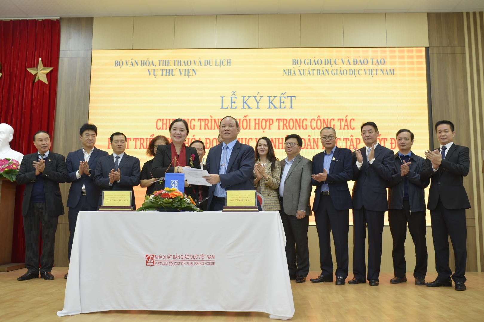 NXB Giáo dục Việt Nam cũng sẽ tiến hành hỗ trợ Vụ Thư viện cung cấp hệ thống phần mềm, các cơ sở dữ liệu, sách và nhiều tài liệu khác để phát triển đề án văn hóa đọc; biên soạn tài liệu hướng dẫn phương pháp, kỹ năng đọc, truyền cảm hứng, hình thành thói quen đọc trong nhân dân. NXB sẽ đồng hành cùng Bộ VHTTDL trong các nỗ lực thực hiện hiệu quả nhiều mục tiêu của đề án phát triển văn hóa đọc và đẩy mạnh các hoạt động phục vụ người dân học tập suốt đời trong các thư viện.