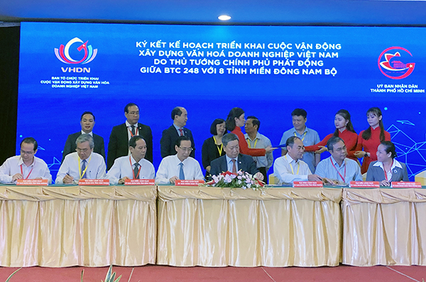 Dịp này, BTC 248 và đại diện lãnh đạo UBND 8 tỉnh,thành khu vực miền Đông Nam Bộ đã ký kết kế hoạch phối hợp triển khai Cuộc vận động xây dựng VHDN đến cộng đồng doanh nghiệp các địa phương.