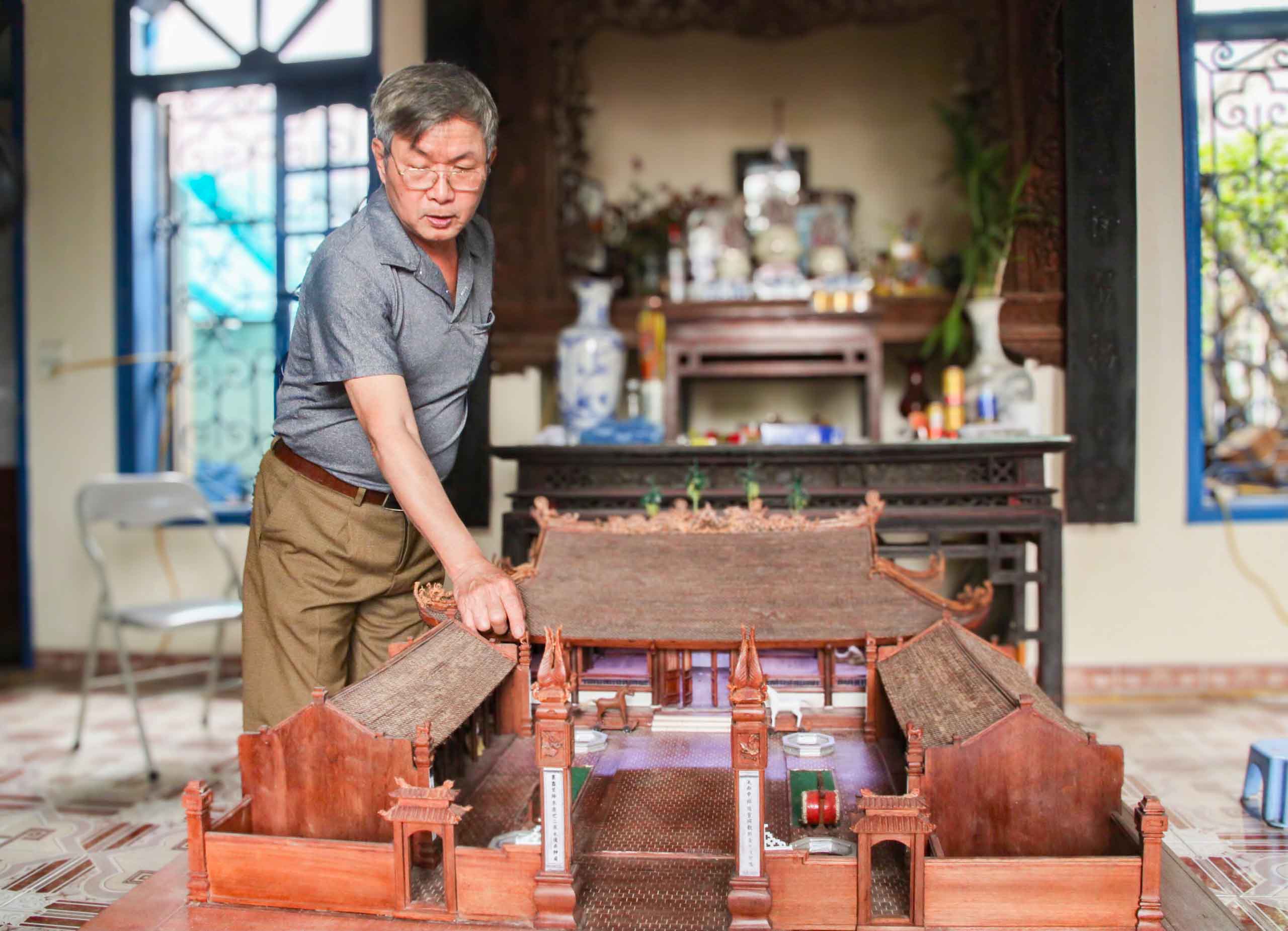 Nghệ nhân Phan Lạc Hùng nâng niu mô hình đình làng Hữu Bằng do chính bàn tay ông chế tác