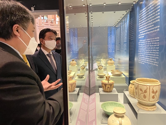 Thứ trưởng Hoàng Đạo Cương xem các hiện vật tại triển lãm