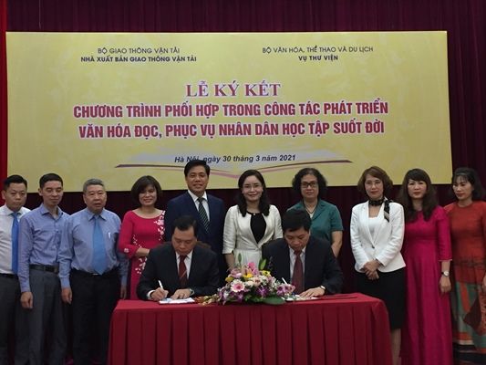 VHO - Sáng 30.3 tại Hà Nội, Vụ Thư viện (Bộ VHTTDL) và Công ty TNHH MTV Nhà xuất bản Giao thông vận tải (Bộ GTVT) đã ký kết chương trình phối hợp công tác nhằm phát triển văn hóa đọc, phục vụ nhân dân học tập suốt đời. Dự và chứng kiến Lễ ký kết có Thứ trưởng Bộ VHTTDL Trịnh Thị Thủy, Thứ trưởng Bộ GTVT Nguyễn Ngọc Đông và đại diện các Cục, Vụ... của hai Bộ.